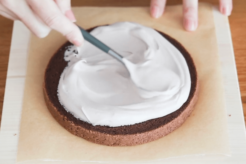 ③土台の生地にクリームをおき広げ、もう一枚生地をかぶせる。