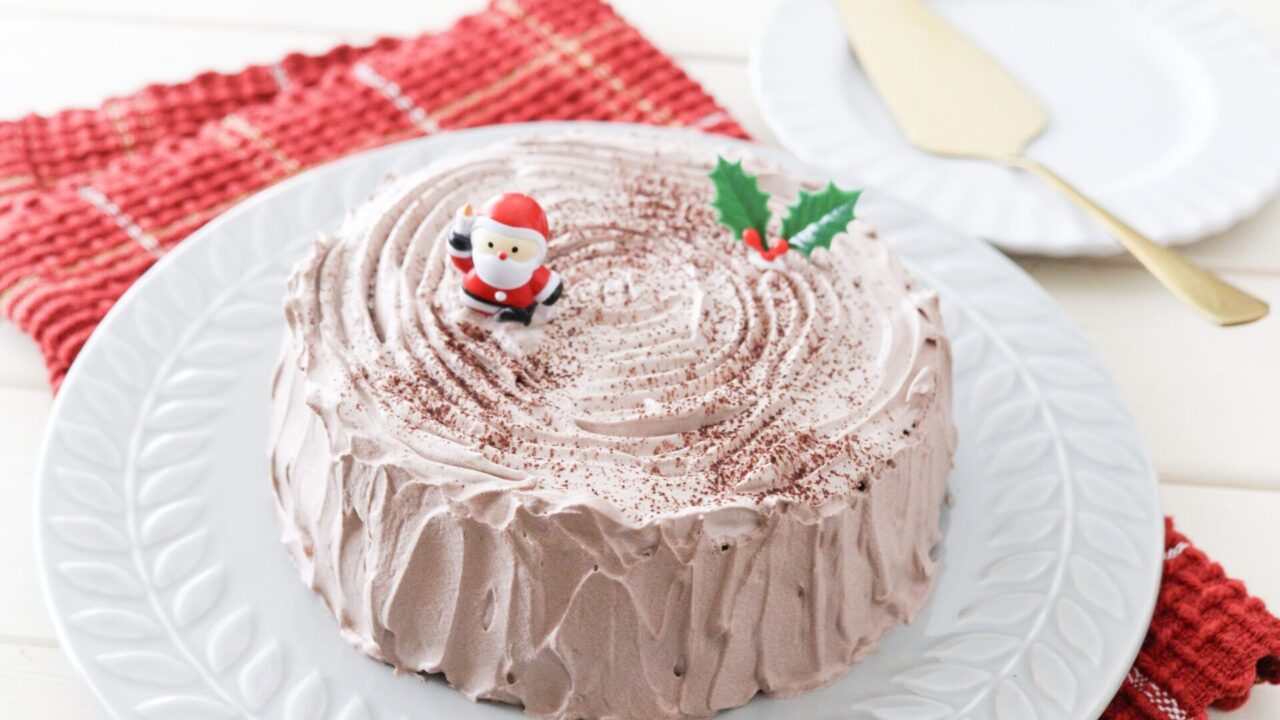 米粉で作る卵・小麦・乳製品不使用のブッシュドノエル風クリスマスケーキレシピです。