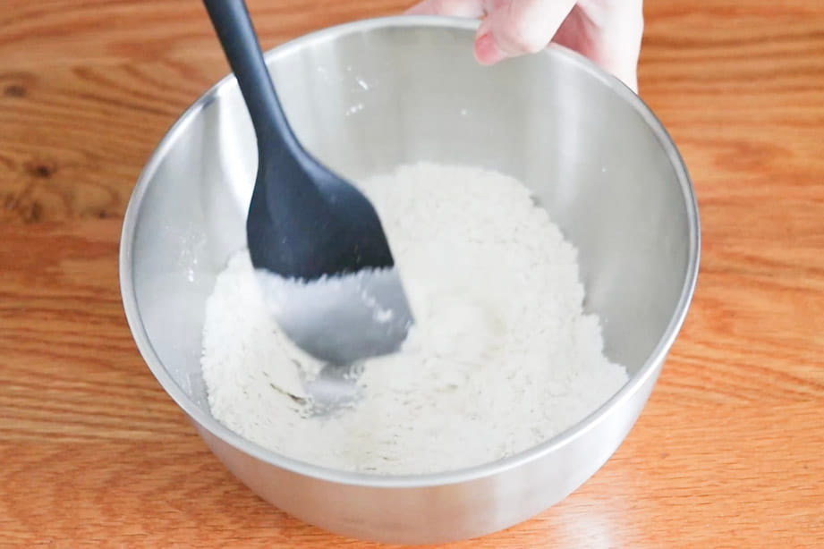 ②①に水、植物油をいれてゴムベラで混ぜ合わせる。